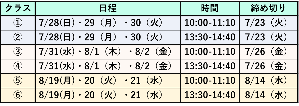 夏限定の短期講座は3日間コース!(70分×3日)で完結する集中型!