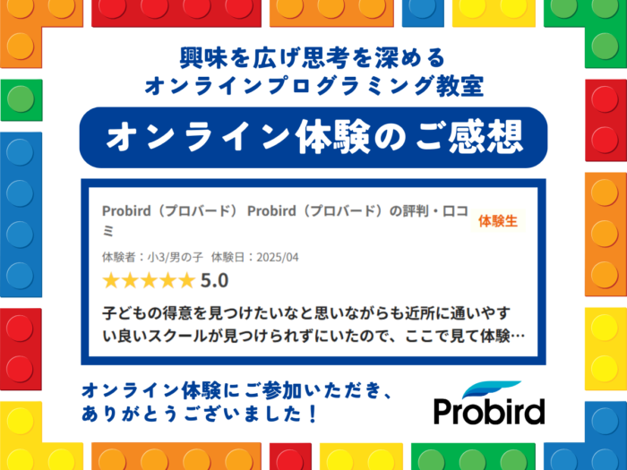 ◇体験者:小3/男の子 【体験された保護者様のお声】 子どもの得意を見つけたいなと思いながらも近所に通いやすい良いスクールが見つけられずにいたので、ここで見て体験しなければ飛び込めなかったオンラインのレッスンに出会えてよ…